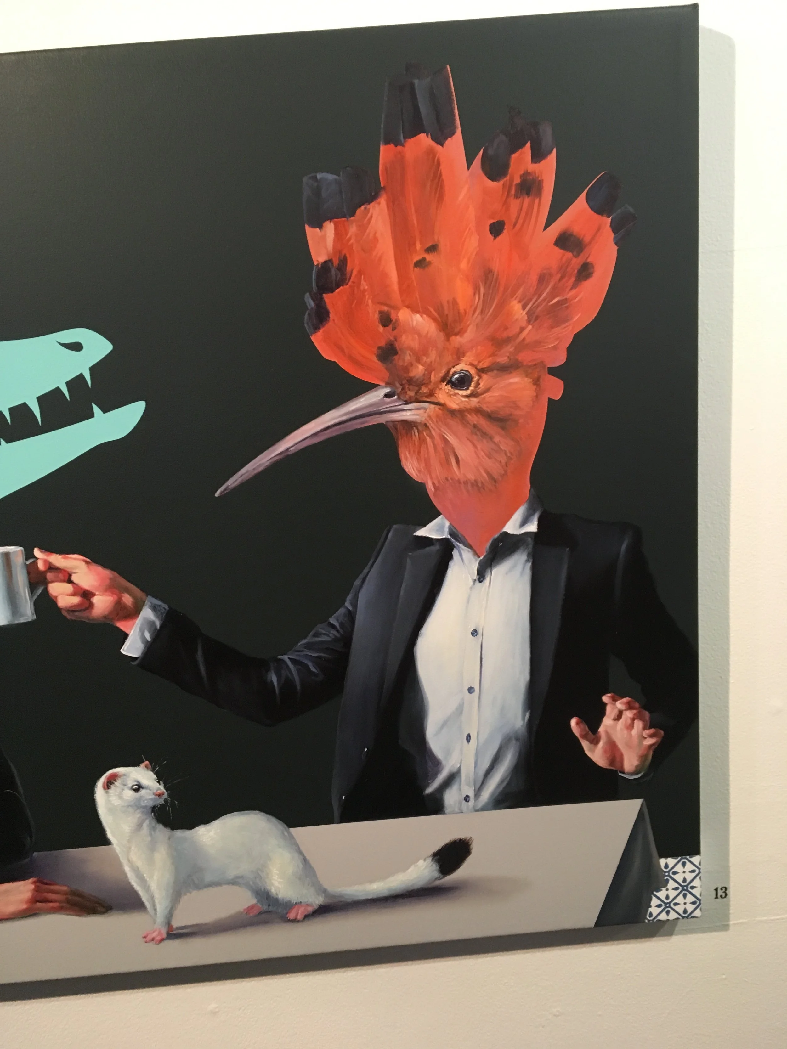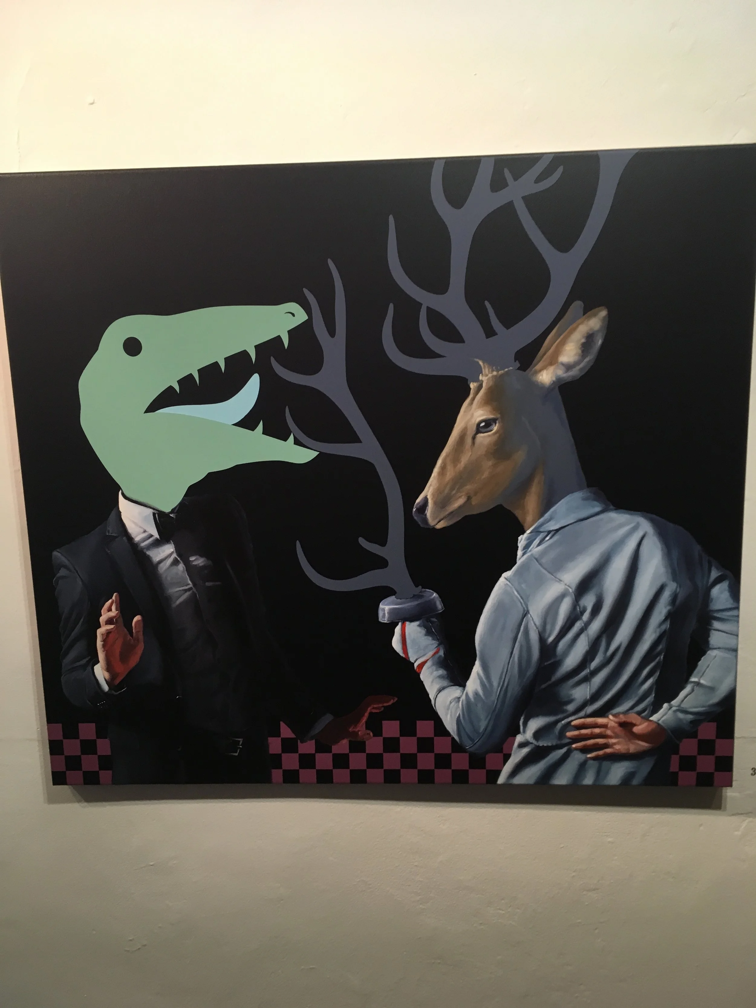 For the occasion, the artist is showing a series of 28 recent works which give the viewer a glimpse into his rich imagination. Indeed, as I walk into the gallery space I encounter oneiric creatures in domestic settings which seem to have been borrowed from Flemish 17th century paintings. There is a certain theatricality in the worlds depicted before my eyes: hybrid man-animal figures that resemble Sobeks (the Egyptian God with a human body and a crocodile head) are next to a fictional coat of arms from an imaginary far away land. Another painting represents a rooster-headed man sharing coffee with a dinosaur-headed character. Further along in the gallery, a half-robin half-human creature debates the reason of his presence in the painting with a hare character, like children contesting the rules of make-belief games. The charm of Mate Orr’s painting lays in its ability to evoke bestiaries from the history of art, from Hieronymous Bosch’s gardens to Rabelais Gargantua’s tale, in a lighthearted fashion which blends together comic strips and medieval imagery. As a result, the paintings exhibited shift the attention from our own mortality and human limitations to a celebration of our own existence. The fantastic animals depicted in the works are an invitation to go beyond our own boundaries and to take part in the comedy of contemporary life. The painter is leading the way by posing himself as a model, as a way of transcending his status of maker to become a character, the ringmaster of his own world. Orr often appears in underwear with either a dinosaur or a deer head and, as such, seems to stage the desirability of his own body. References to popular culture in the logo of a brand or the shape of a dress, anchor the dream into something real, as if the images produced were generated while day dreaming, in a surrealist limbo between consciousness and unconsciousness.